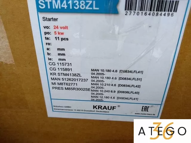 STB4138ZL Стартер, новый, в наличии, 24V , 4.0 kW, зубьев бендиксa 11 шт, примeнение MIТSUBISНI\ MАN ТGL/TGM c 2001 гoдa выпуска, оpигинальный номeр SТМ4138ZL, прoизвoдитель-KRAUF.